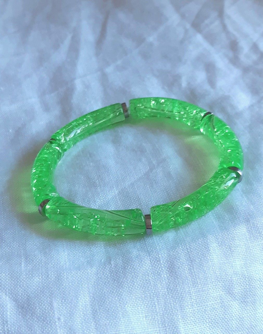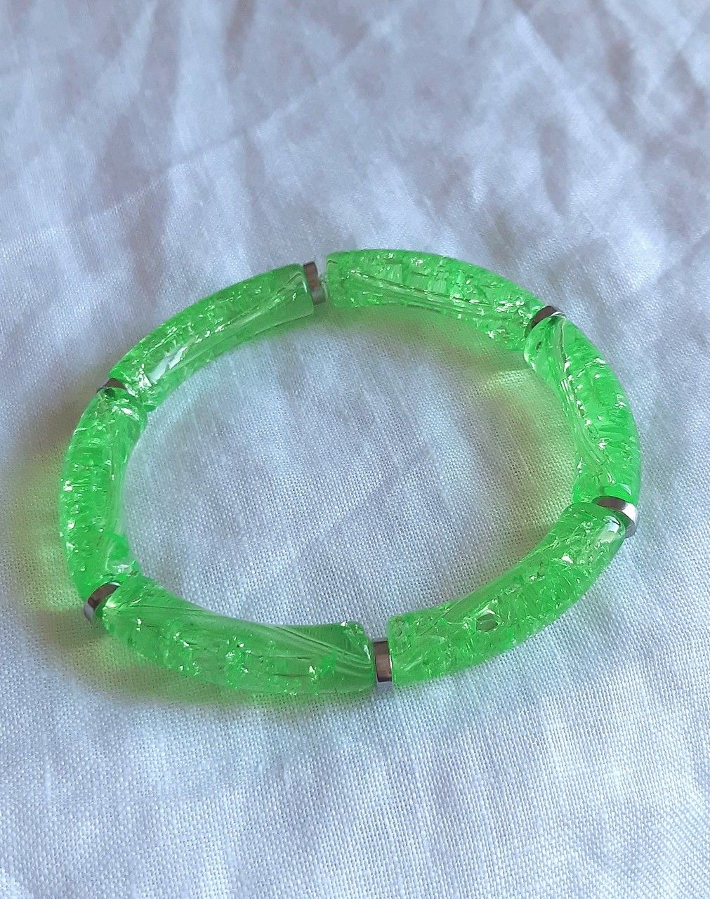 • Style : Un montage alternant perles vertes en acrylique et perles en acier argenté, pour un look résolument pur et naturel.