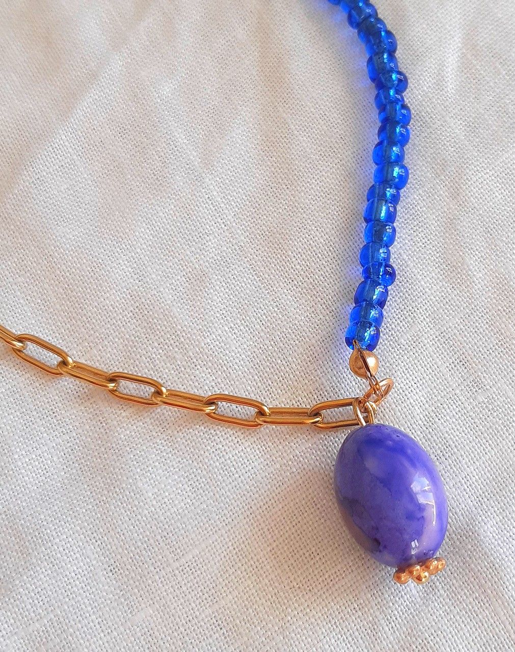 • Collier fantaisie élastique avec perles bleues et chaîne en métal doré